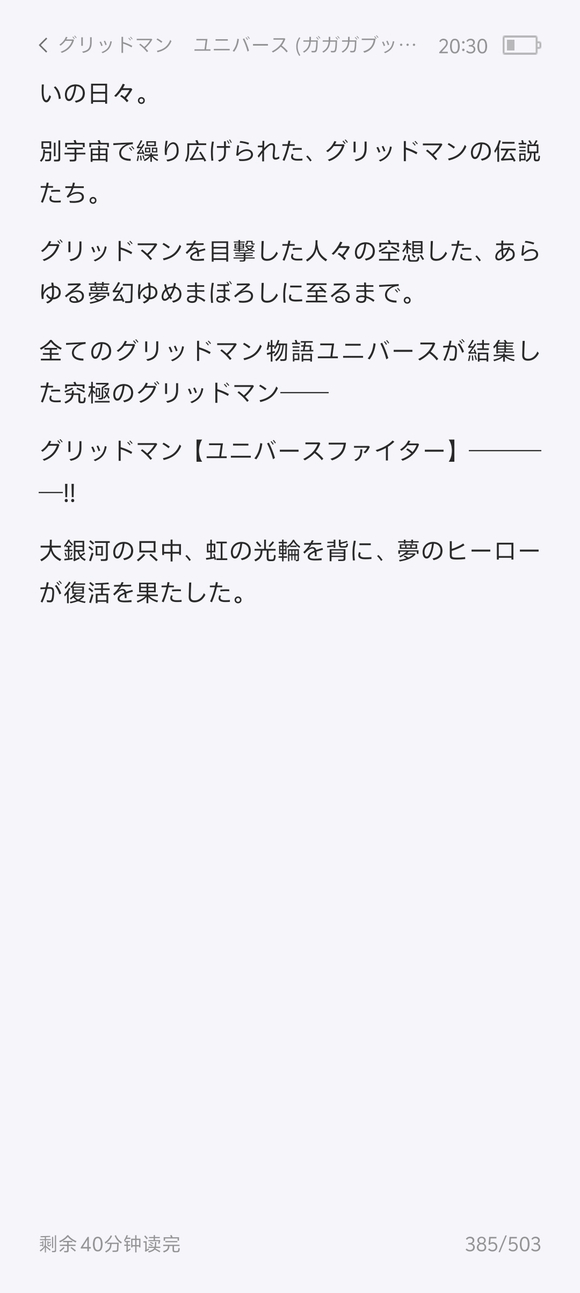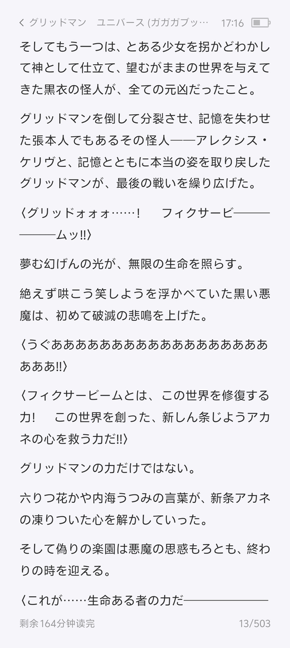 “然后古立特与宇宙合为一体,从古立特的记忆中诞生出了形形色色的世界,包括《SSSS.电光机王》的世界在内,小说、漫画等衍生作品中描绘出的那些世界都是从古立特记忆中诞生的、都是平行存在的。然后所有的宇宙都融合了”
