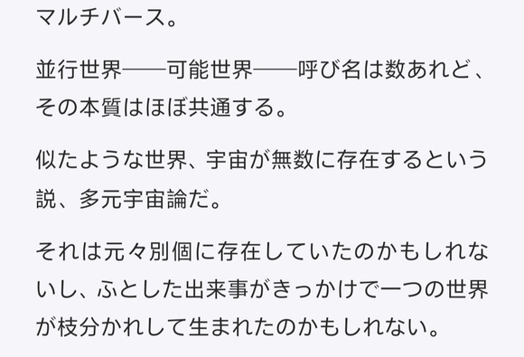 最后,同前面所示即一次事件衍生一个宇宙,可参与分歧的对象有无限个。所分歧出来的也会继续分歧,如作品无限持续下去。