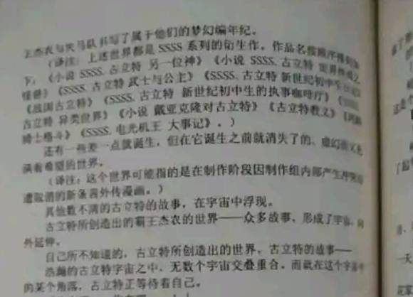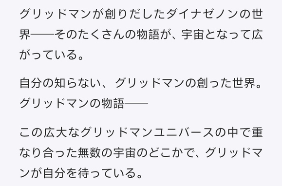 (译注:上述世界都是SSSS系列的衍生作。作品名按顺序排列如下:《小说 SSSS.古立特 另一位神》《小说 SSSS.古立特 世界终焉之怪兽》《SSSS.古立特 武士与公主》《SSSS.古立特 新世纪初中生日记》《战国古立特》《SSSS.古立特 新世纪初中生的执事咖啡厅》《SSSS.古立特 异类世界》《小说 戴亚克隆对古立特》《古立特教义》《网路骑士格斗》《SSSS.电光机王 大事记》。)