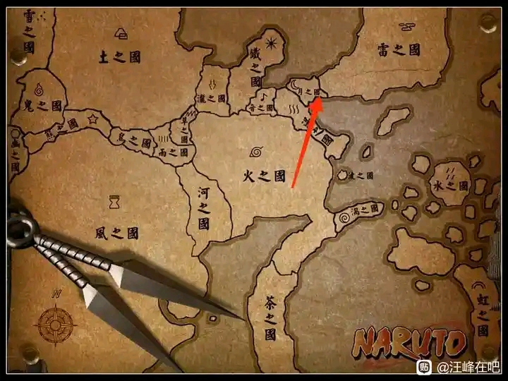 火影里的大国大小,左下角黄色部分是沙之国,右上角箭头部分是雷之国,和地图也对应的上