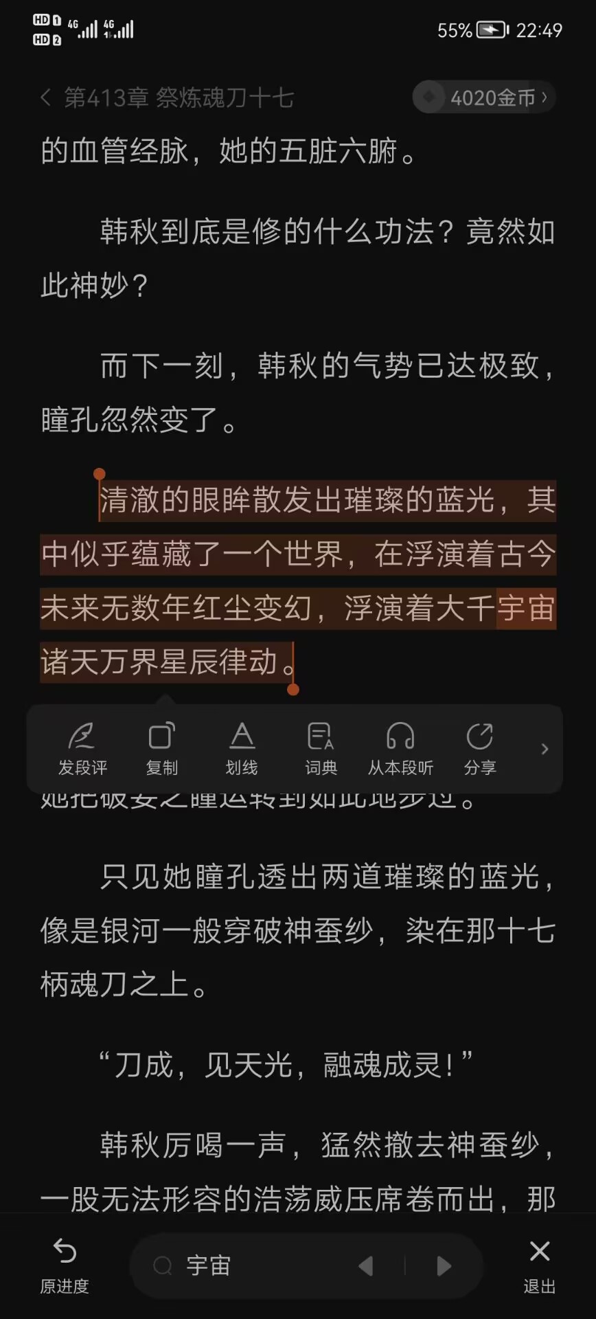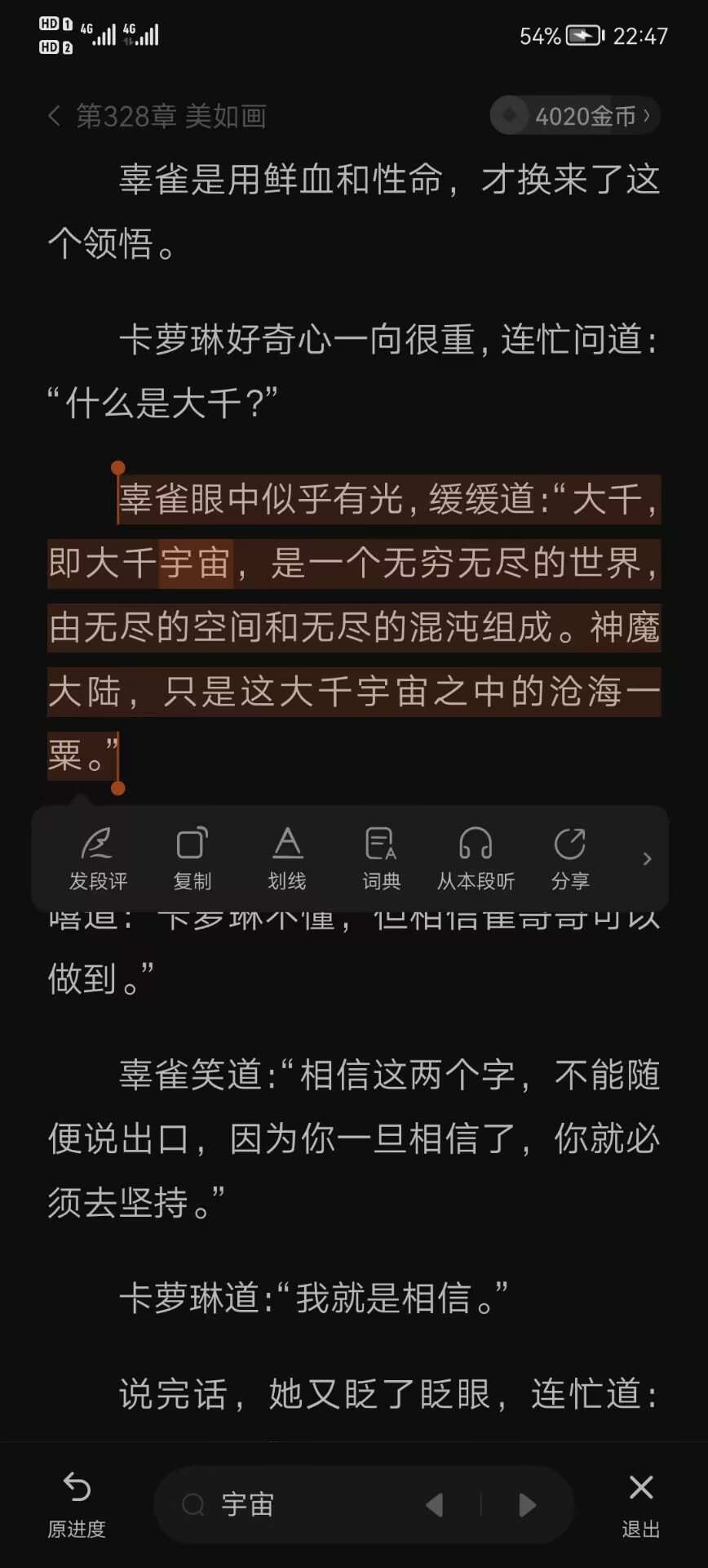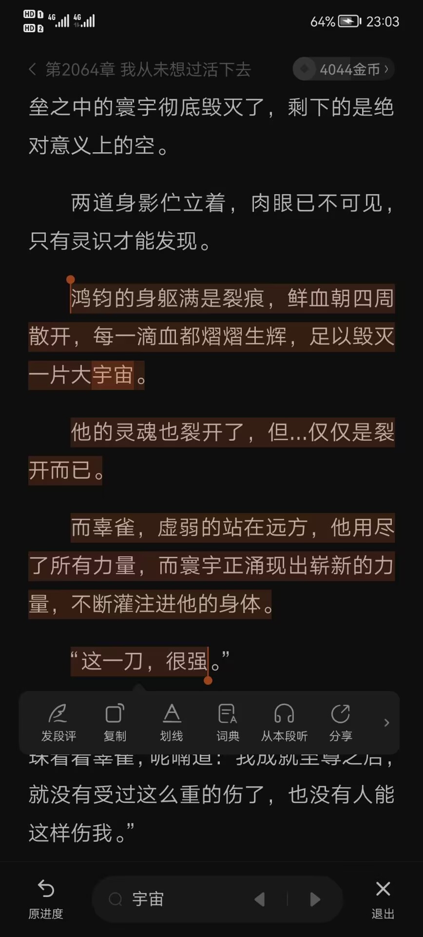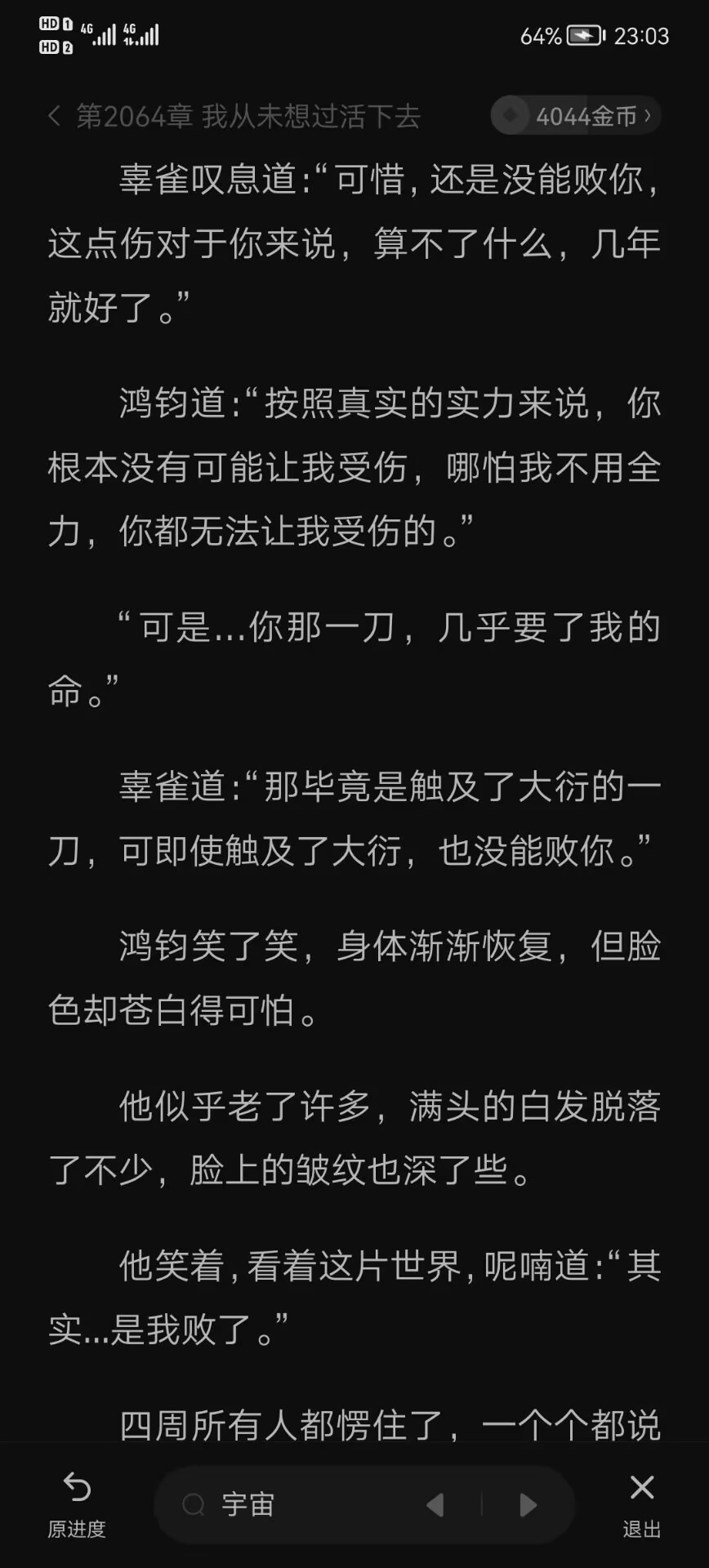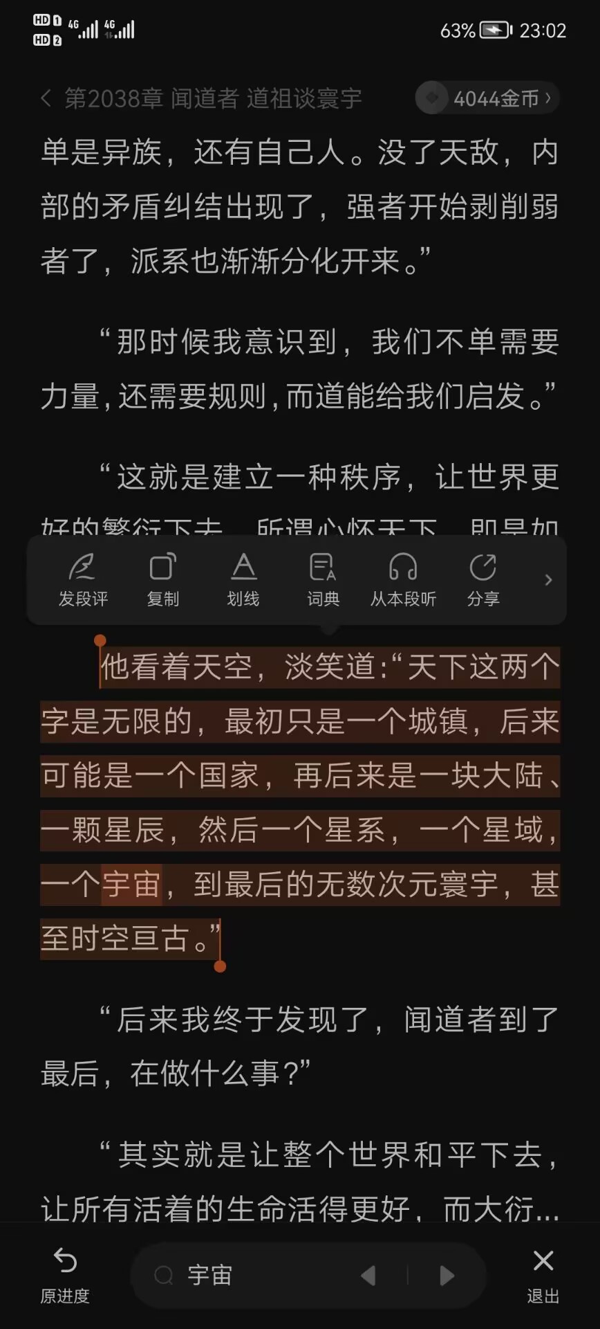 “天下这两个字是无限的,最初只是一个城镇,后来可能是一个国家,再后来是一块大陆、一颗星辰,然后一个星系,一个星域,一个宇宙,到最后的无数次元寰宇,甚至时空亘古。”