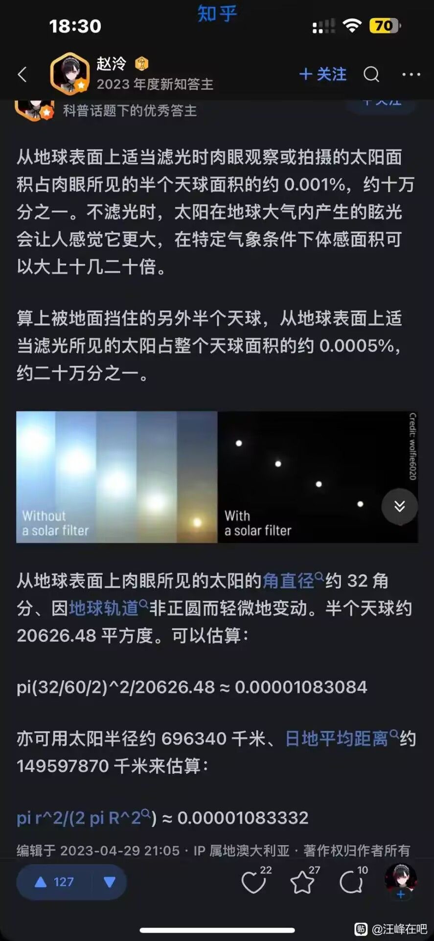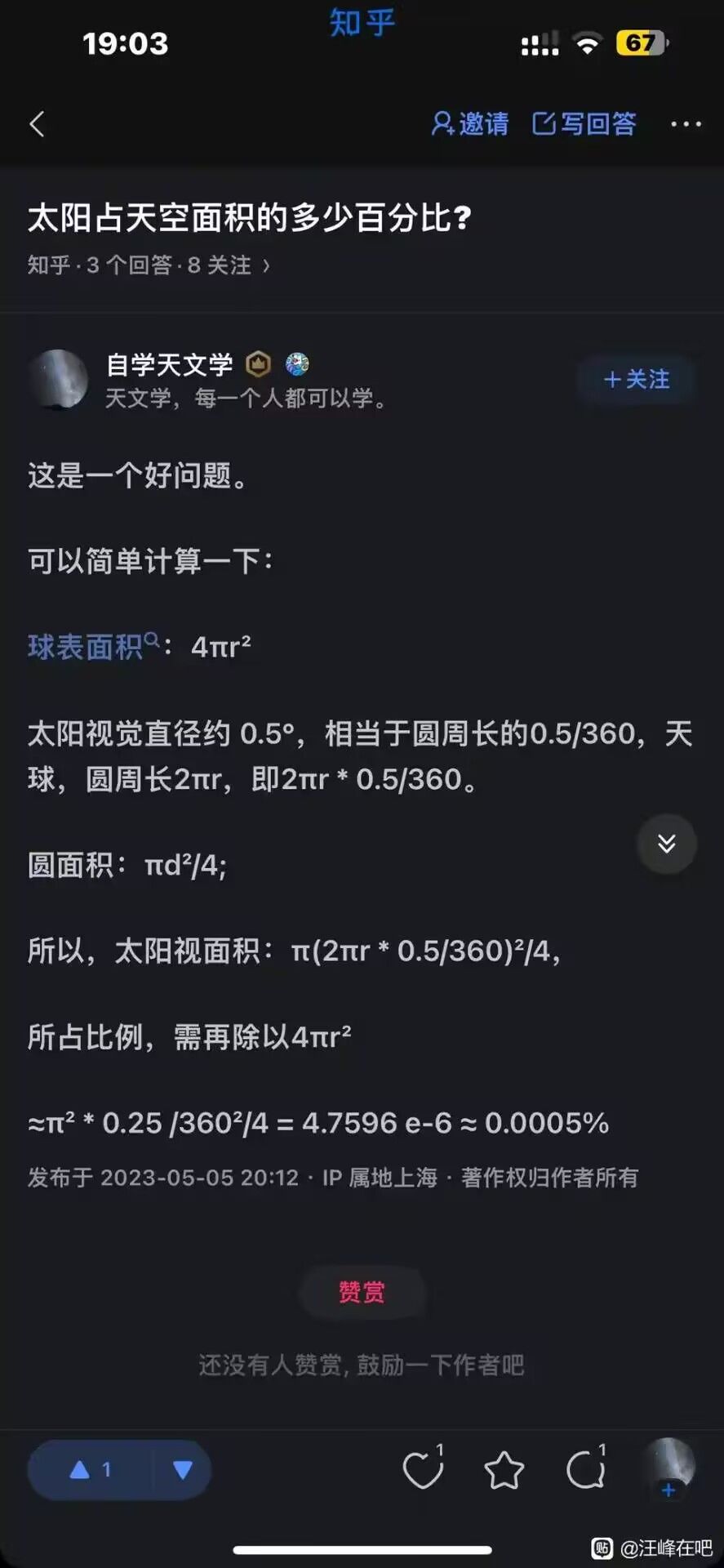 百分之0.001是地球上人眼所见的太阳与天空比例。百分之0.0005是地球整个天空与人眼所见太阳的比例