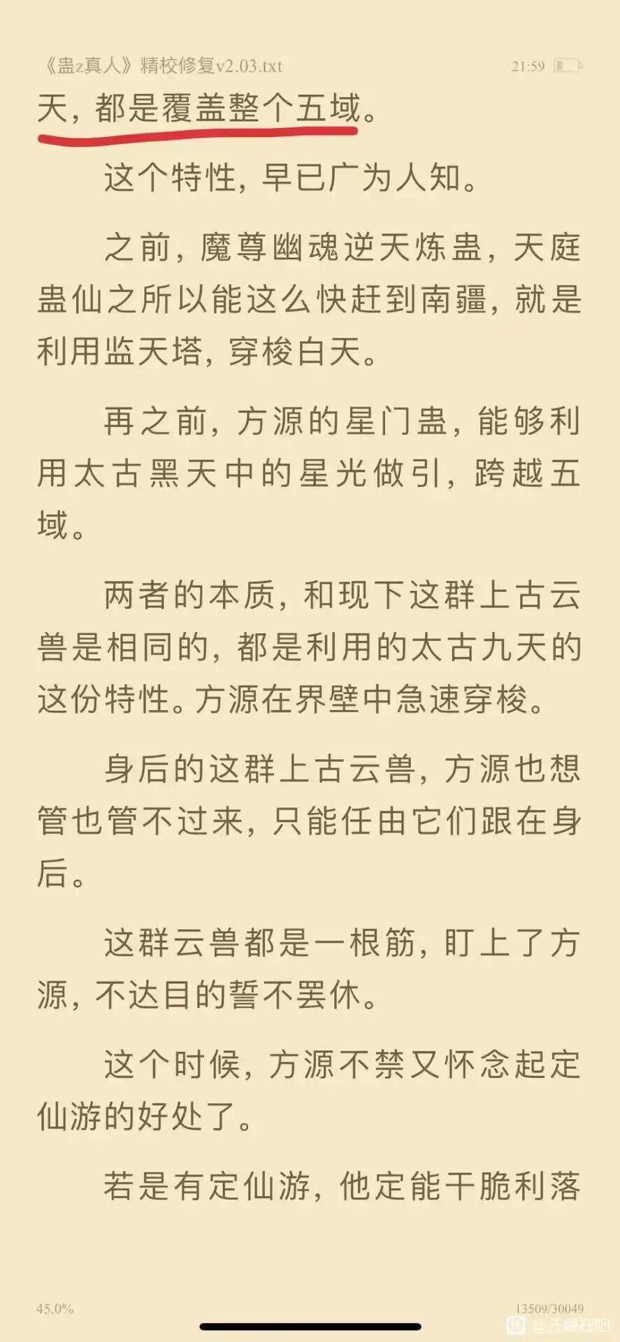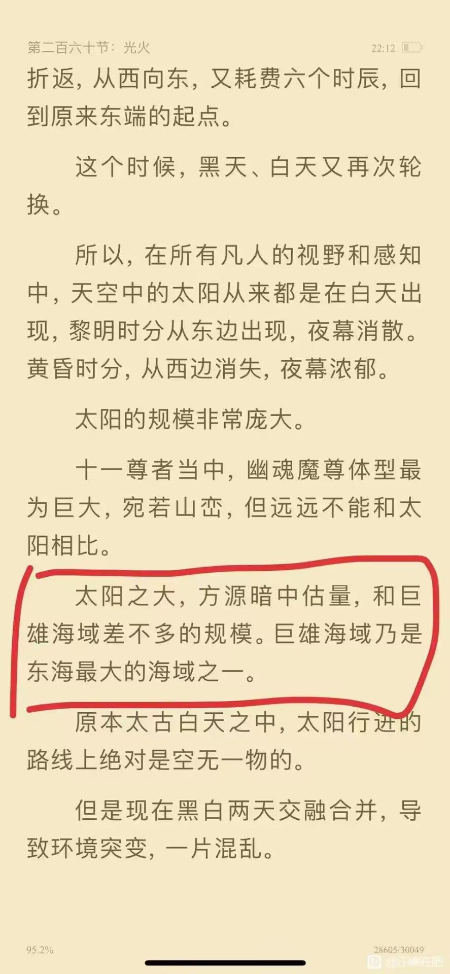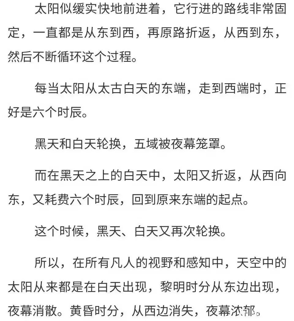 前面说过九天的面积保底要大于等于五域。这里可以看到太古白天中,太阳的运行规律是参考现实中进行的。蛊界有穿越者(天外之魔),没有任何穿越者提到太阳跟地球运行规律不同。所以我们可以将太阳与天空的比例对等现实,从而得出白天大小