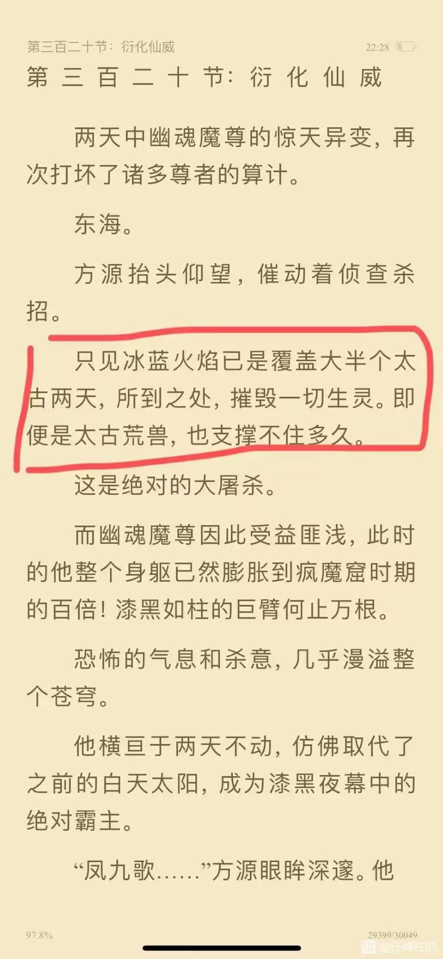 幽魂无意识间释放的冰蓝火焰可以短时间内覆盖大半个两天此时的幽魂与九转火蛊共生,且神智不清。也就是说:这只是尊者加单只九转蛊的威力表现,并未使用杀招。可以叠给任何尊者一段时日后幽魂的冰蓝火焰覆盖两天,并将其改造为幽天。因为不是“一击”范畴,所以不认