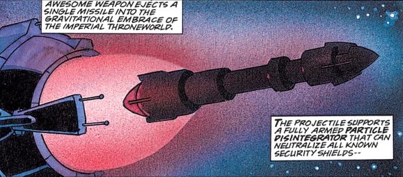 Each of these projectiles was capable of traveling through hyperspace with a speed equivalent to at least a Class .75 hyperdrive, allowing for quick traversal of interstellar distances and difficulty in detecting them until they struck. Upon exiting hyperspace and homing in on its target, the projectile's automated defenses would activate to deter enemy forces. Automated laser cannon turrets exchanged laser fire with warships while thick armor plating and powerful energy shields deflected even the most advanced ion cannons and turbolasers.