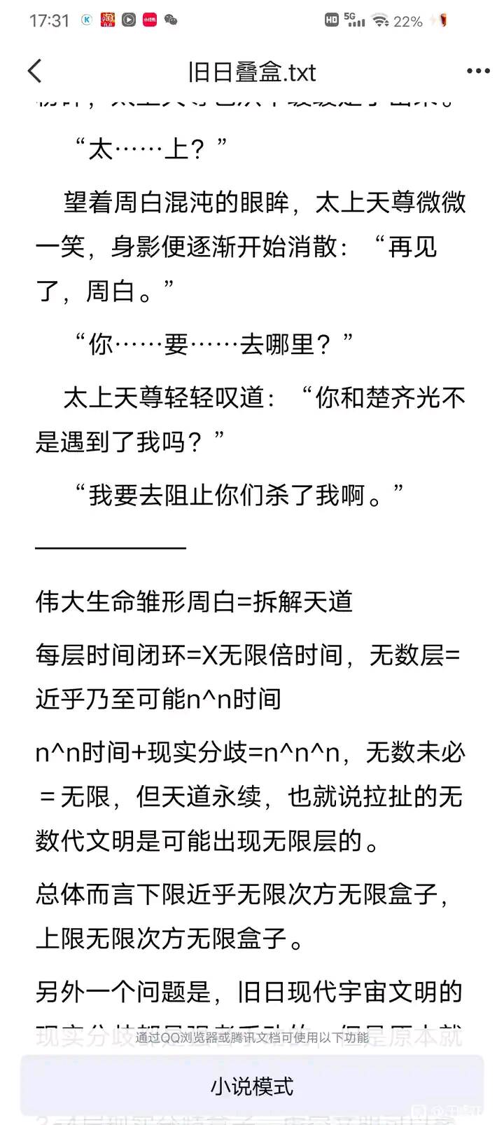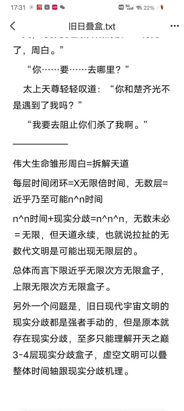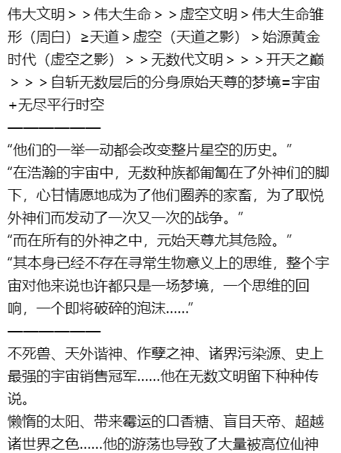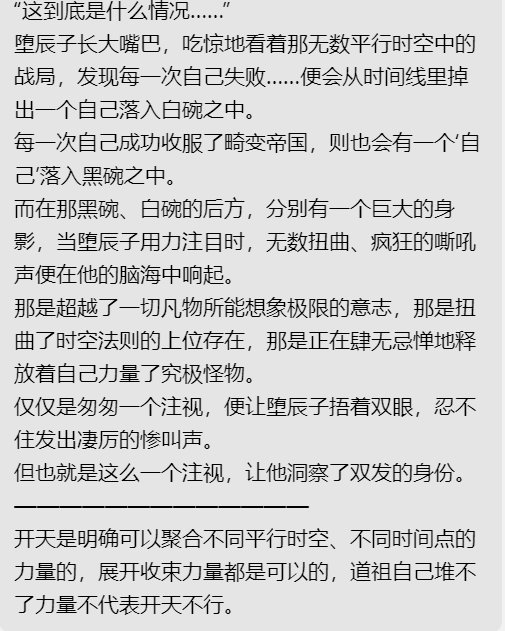 另外,我说的上下级包涵也体现在道祖自己身上,前文无穷可能平行世界→百万时间线,反而可以理解成不同上下级关系,这点其实也体现在通圣的无数历史分支被道祖的前文的时间线包涵