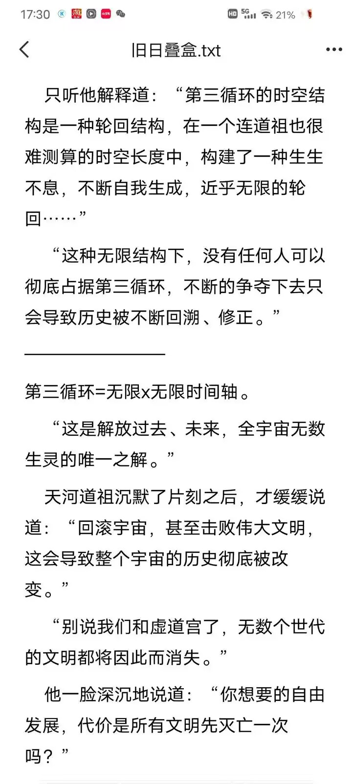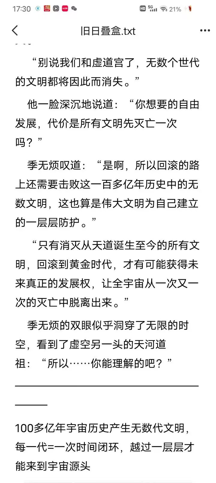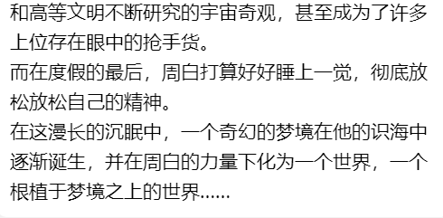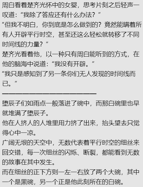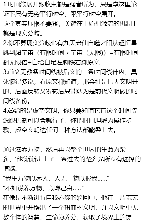 其次这个根本不要紧,只是论证下层时空也有无穷平行时空,另外一个就是平行文明的无尽平行时空,而且这些都会被强者收束,后面也提到了问题为什么开天之巅只能叠几层的原因就是这个,关键在于虚空文明有时间资源上去。