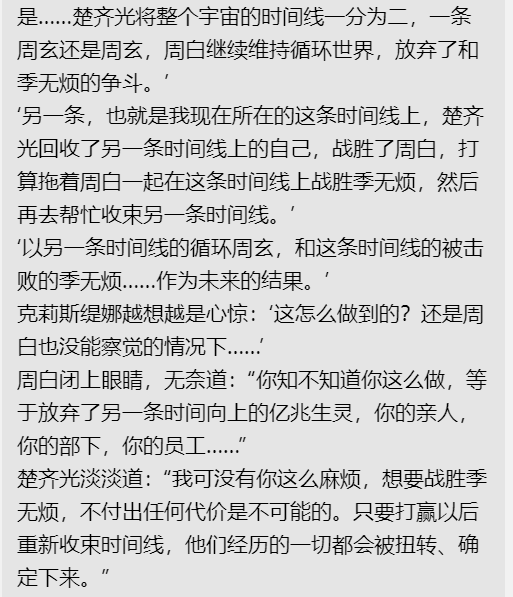 “为了防止世界走向某些违逆了创造者意愿的未来,做一个备份就很有必要。两条时间线可以相互参照进行修正,甚至直接抹除异常的时间线后,以另一条时间线为基准,再次开辟两条时间线。”