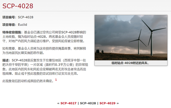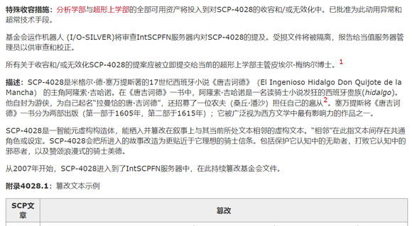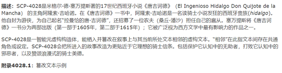 “SCP-4028是一智能元虚构构造体,能栖入并篡改在叙事上与其当前所处文本相邻的虚构文本。“相邻”在此指文本间存在共通角色或设定。SCP-4028会把所进入的故事改造为更贴近于它理想的骑士信条。包括保护它认知中的无助者,打败它认知中的邪恶者,以及赞颂浪漫式的骑士美德。”