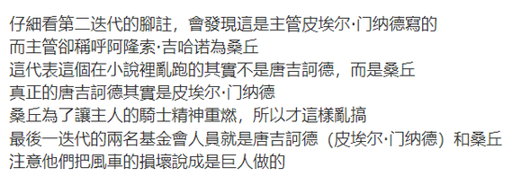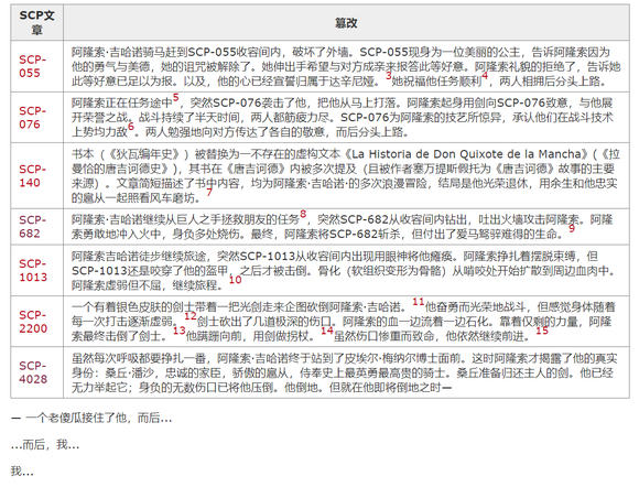 SCP-4028修改叙事把文档变成自己,也就是“阿隆索·吉哈诺”的骑士之旅,陆续击败几个SCP,来到SCP-4028的文档面对超形上学部主管皮埃尔·梅纳尔,揭露自己的真实身份“桑丘·潘沙”,力竭倒地……然后,被人接住。