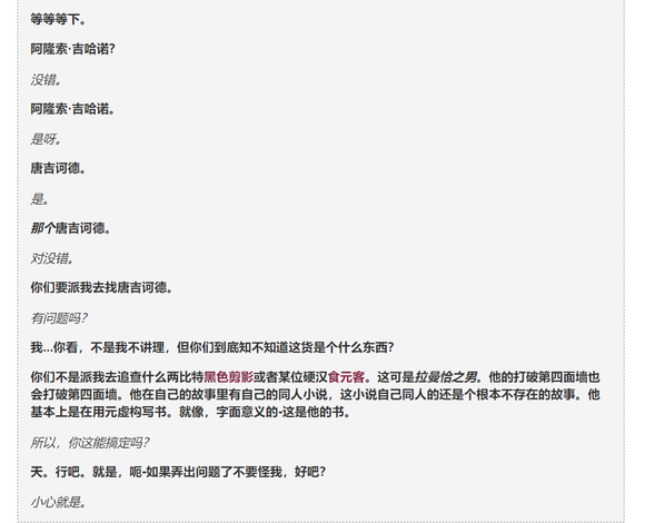 超形上学部派Fred进入被SCP-4028影响的《孤儿故事》去调查唐吉诃德,而Fred说: