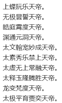 十方神王,水府旸谷神王,东方无极飞天神王。南方无极飞天神王。西方无极飞天神王。北方无极飞天神王。东北方无极飞天神王。东南方无极飞天神王。西南方无极飞天神王。西北方无极飞天神王。上方无极飞天神王。下方无极飞天神王,江渎广源王。河渎灵源王。淮读长源王。济渎清源王。紫微垣帝座星君。太微垣帝座星君。天市垣帝座星君。