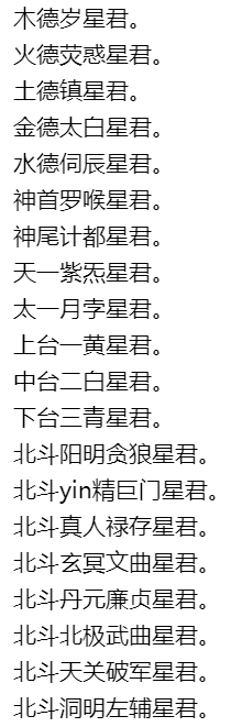 南斗天府司命上相星君。南斗天相司录上相星君。南斗天梁延寿保命星君。南斗天同益算保生星君。南斗天枢度厄文昌星君。南斗天机上生大理星君。角宿星君。亢宿星君。氏宿星君。房宿星君。心宿星君。尾宿星君。箕宿星君。斗宿星君。牛宿星君。女宿星君。虚宿星君。危宿星君。室宿星君。壁宿星君。奎宿星君。娄宿星君。胃宿星君。昴宿星君。毕宿星君。觜宿星君。参宿星君。井宿星君。鬼宿星君。柳宿星君。星宿星君。张宿星君。翼宿星君。轸宿星君。