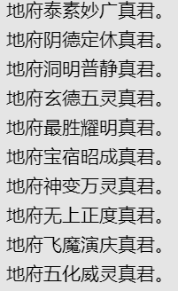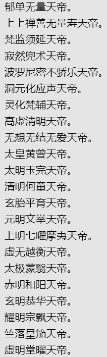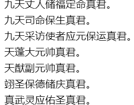 南上度人不死神君.扬州社令神君。兖州社令神君。青州社令神君。徐州社令神君。豫州社令神君。刻州社令神君。冀州社令神君。雍州社令神君。梁州社令神君。平育举清左相,灵虚玉婴大君,南上司命司录君,顺济龙王,