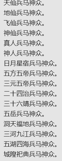 天仙地仙飞仙神仙真人神人兵马。玄灵元老,法箓部
